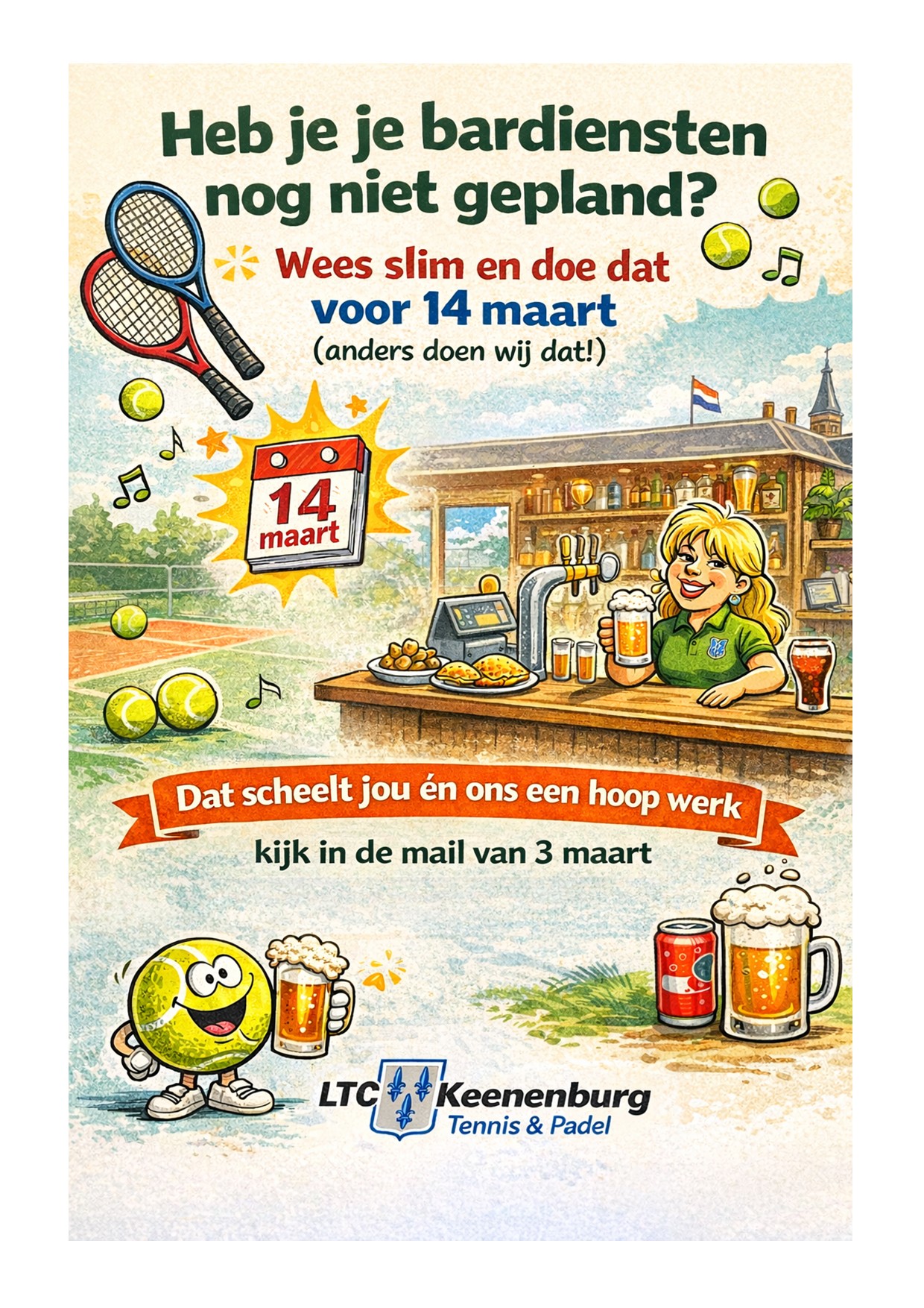 Heb je de bardienst email gemist? Het seizoen gaat binnenkort weer echt van start met tennis en padel. Hiermee gaat ook het bardienst-seizoen weer van start. We starten dit jaar iets eerder dan 1 april omdat er vanaf 21 maart a.s. Clubkampioenschappen Enkel beginnen.
